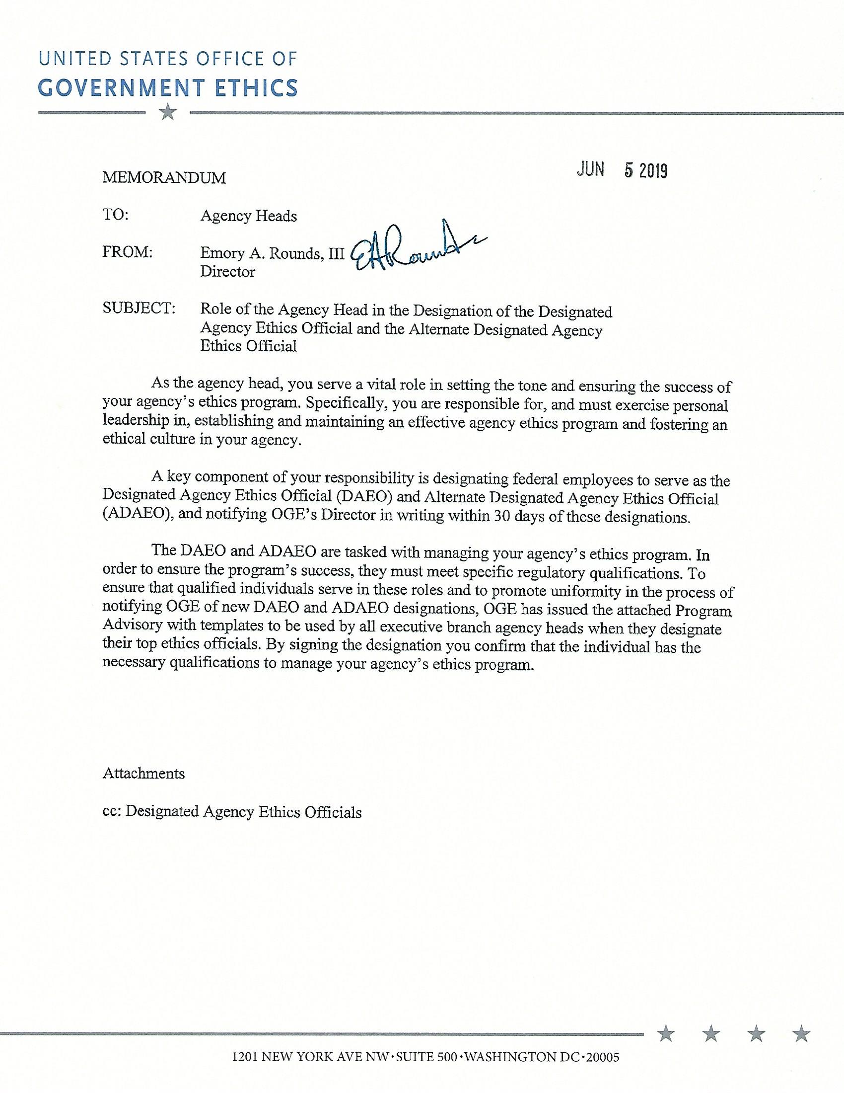 I recently sent a memo to the heads of all executive branch agencies reminding them of their responsibility to foster an ethical culture and to ensure the success of their agency’s ethics program. I specifically highlighted their responsibility to designate qualified employees to serve as their agency’s top ethics officials. To assist them with this responsibility, OGE has created new templates for agency heads to use when designating the Designated Agency Ethics Official and Alternate Designated Agency Ethics Official. These templates serve to ensure that agency heads confirm that the individuals have the necessary qualifications to manage their ethics agency’s ethics program and to improve uniformity across the executive branch.